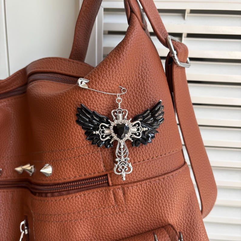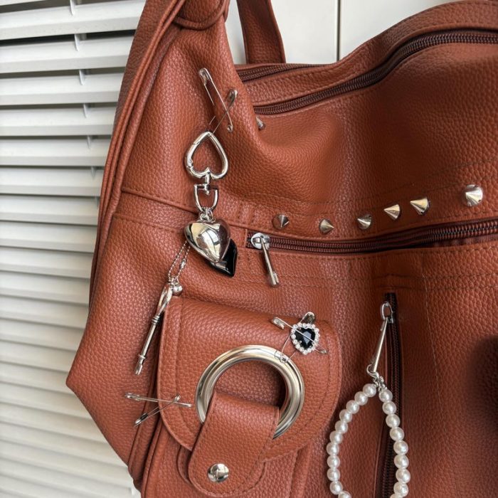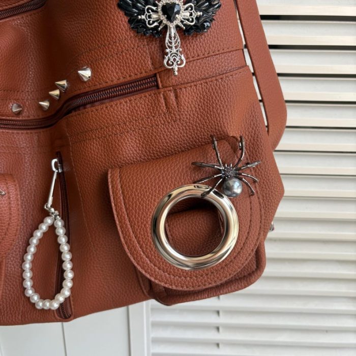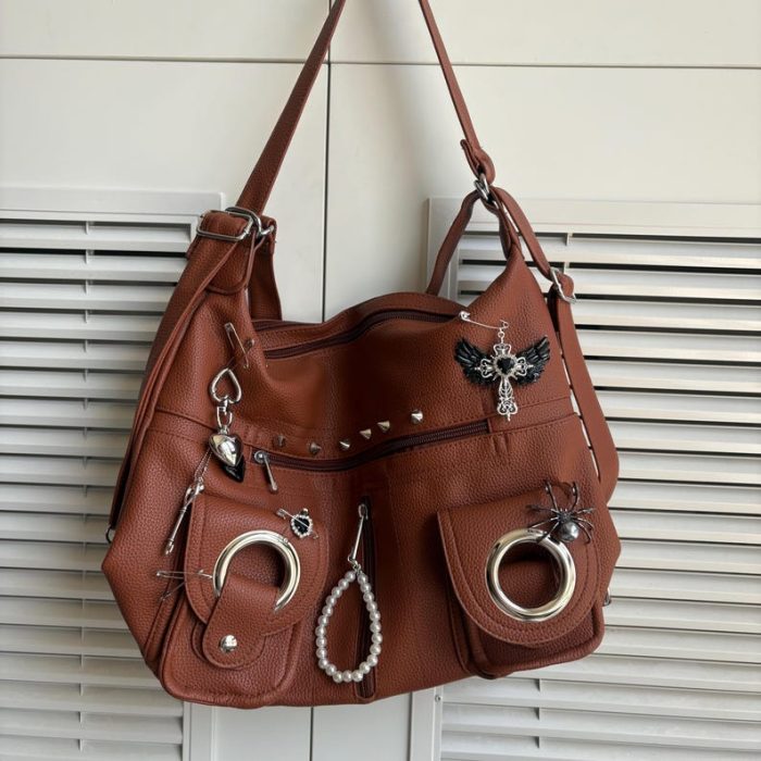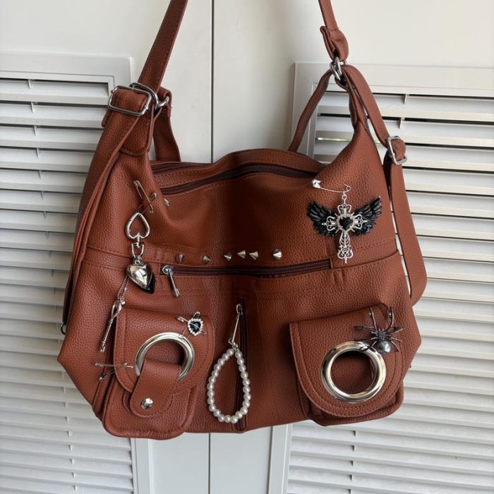 Túi da Y2K nâu đa năng, phom rộng chứa đồ thoải mái cho đi học, đi chơi hay du lịch. Thiết kế có thể đeo vai/đeo chéo/cắp tay và chuyển kiểu balo linh hoạt; chi tiết kim loại nổi bật mang cảm hứng gothic cá tính.