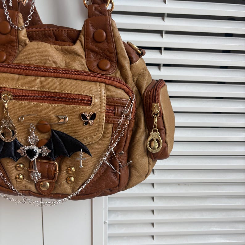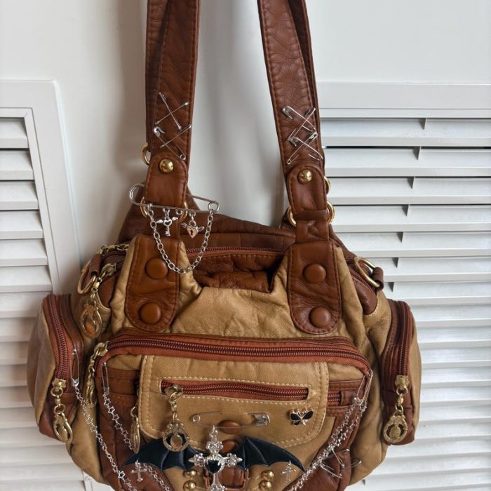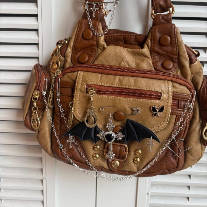 Túi da Y2K punk dung tích tốt, nhiều ngăn tiện sắp xếp đồ và chi tiết kim loại nổi bật, giúp nâng tông outfit theo phong cách gothic cá tính. Phù hợp đi học, đi chơi hay du lịch ngắn ngày.
