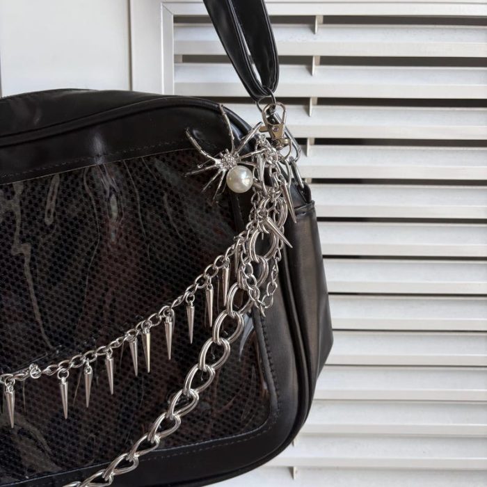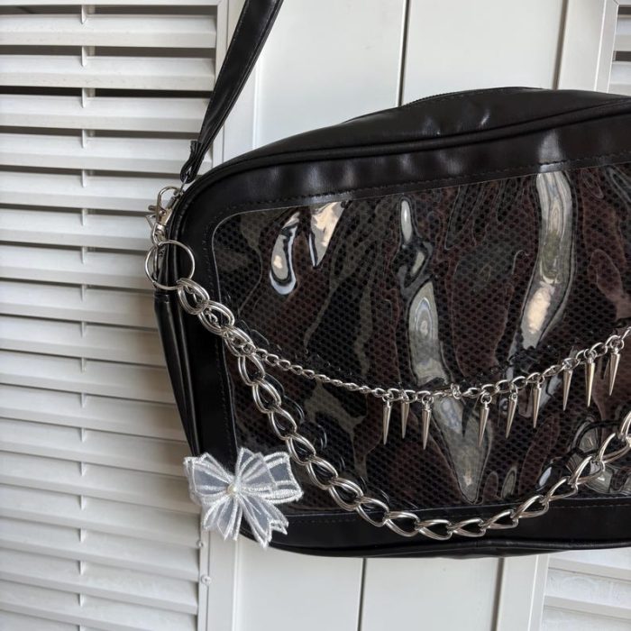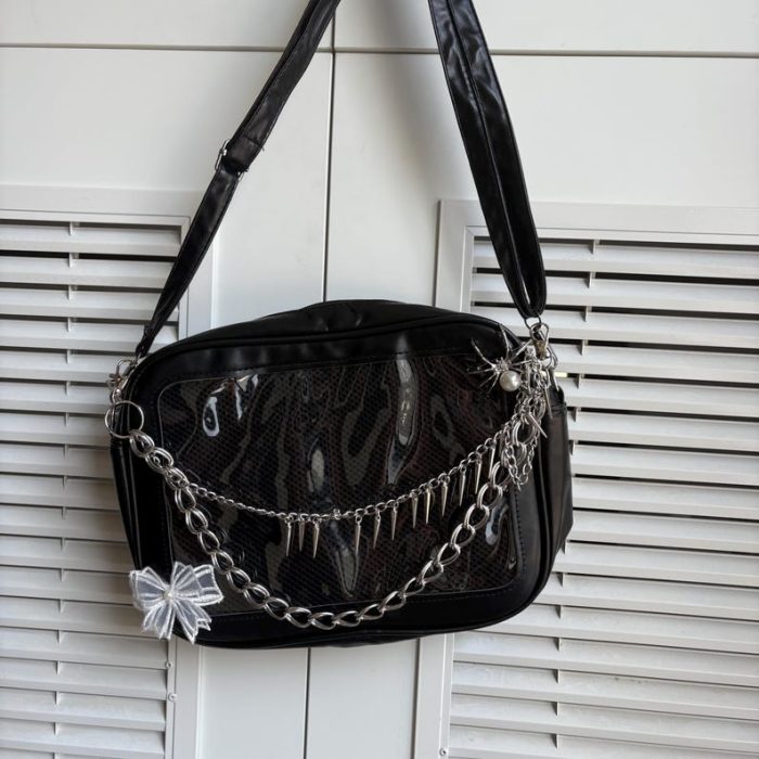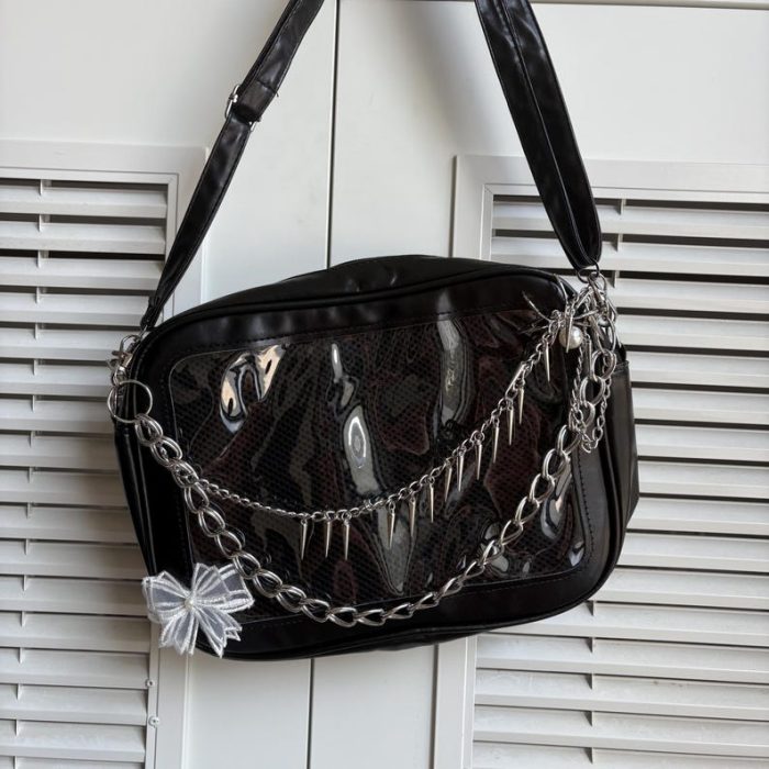 Túi đeo vai ITA da bóng phong cách Y2K/punk, nhấn nhá dây xích bạc và nơ trang trí, giúp outfit nổi bật khi đi chơi hay dự tiệc. Kích thước 25 x 16 x 6 cm gọn gàng, đủ chứa điện thoại, ví nhỏ và đồ cá nhân. Made in Vietnam.