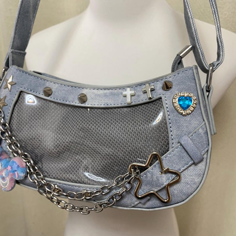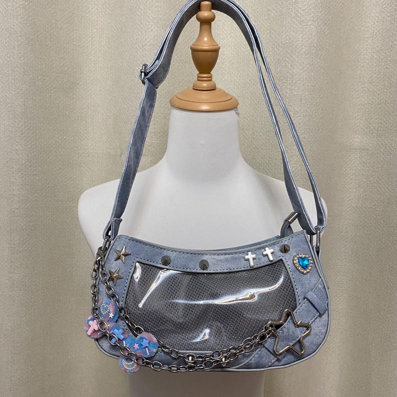 Túi ita denim phong cách Y2K với cửa sổ PVC trong suốt giúp trưng bày pin/badge nổi bật, phom nhỏ gọn dễ phối đồ hằng ngày. Thiết kế tối giản nhưng cá tính, phù hợp đi học, đi chơi hay dự sự kiện.