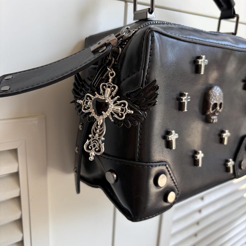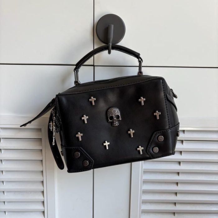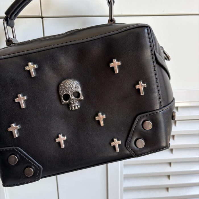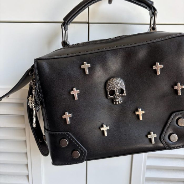 • Thiết kế: Quai xách + dây đeo vai/đeo chéo; mặt trước đính đầu lâu & thánh giá, đinh tán tạo điểm nhấn punk.