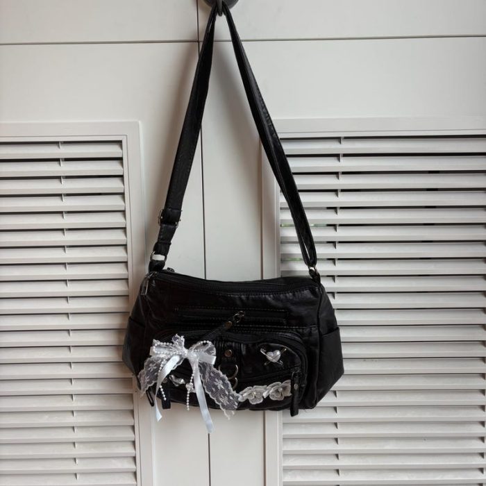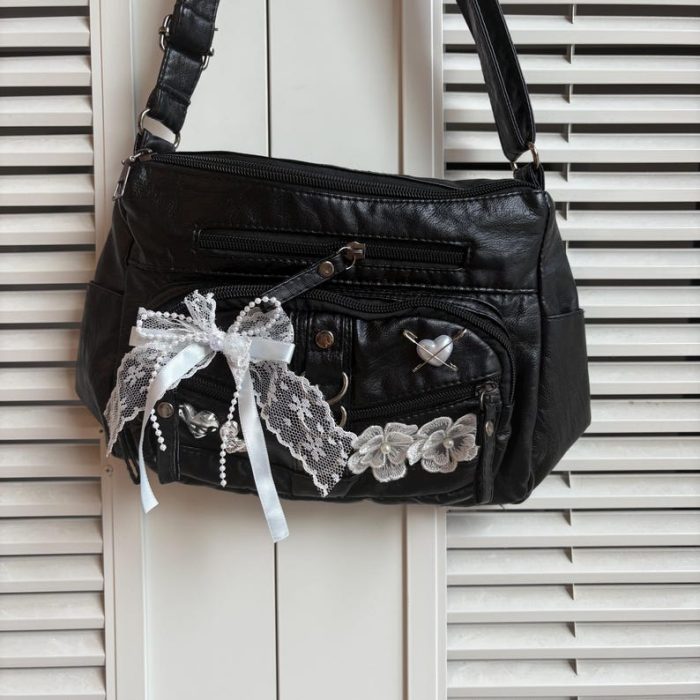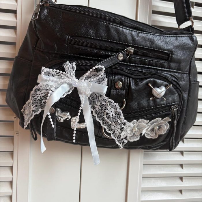 Sản phẩm được làm từ da tổng hợp cao cấp, bền đẹp, có kích thước nhỏ gọn 26 x 18 x 8 cm, vừa đủ để đựng các vật dụng cá nhân cần thiết. Thiết kế nổi bật với các chi tiết trang trí độc đáo như ren trắng, nơ, ngọc trai và hoa vải, tạo nên vẻ ngoài ấn tượng, cá tính. Túi đi kèm cả quai đeo vai và dây đeo chéo, mang lại sự linh hoạt khi sử dụng.