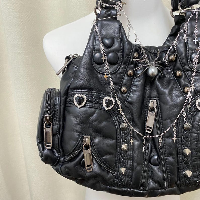 Sản phẩm được làm từ da tổng hợp cao cấp, bền đẹp, có kích thước rộng rãi 30.5 x 20 x 14 cm. Túi có nhiều ngăn tiện lợi, giúp bạn sắp xếp đồ dùng gọn gàng. Thiết kế nổi bật với các chi tiết đính kim loại như đinh tán, dây xích và hình trái tim, tạo nên vẻ ngoài mạnh mẽ, cá tính. Túi đi kèm với cả quai xách tay và dây đeo chéo, mang lại sự linh hoạt khi sử dụng.