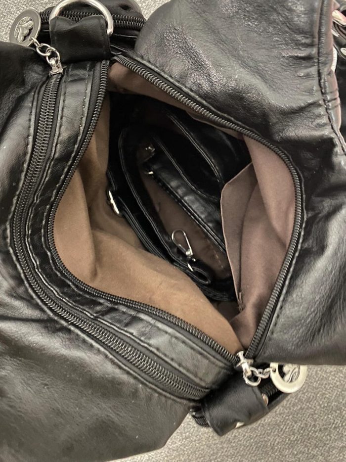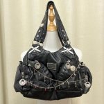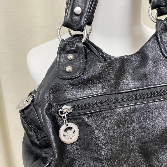 Sản phẩm được làm từ da tổng hợp cao cấp, có kích thước rộng rãi 30.5 x 20 x 14 cm, tiện lợi để đựng nhiều vật dụng cá nhân. Thiết kế nổi bật với nhiều chi tiết trang trí độc đáo như dây xích, huy hiệu và các khóa kim loại, tạo nên phong cách mạnh mẽ, ấn tượng. Túi đi kèm với cả quai xách tay và dây đeo chéo, mang lại sự linh hoạt khi sử dụng.