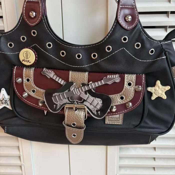 Túi được làm từ da tổng hợp cao cấp, bền đẹp, có kích thước 32 x 17 x 8 cm, vừa đủ để đựng các vật dụng cá nhân cần thiết. Thiết kế nổi bật với các chi tiết kim loại đính tán, khóa trang trí và họa tiết đàn guitar đôi, tạo nên vẻ ngoài ấn tượng, cá tính. Màu đen chủ đạo kết hợp với mảng màu đỏ tạo điểm nhấn mạnh mẽ.