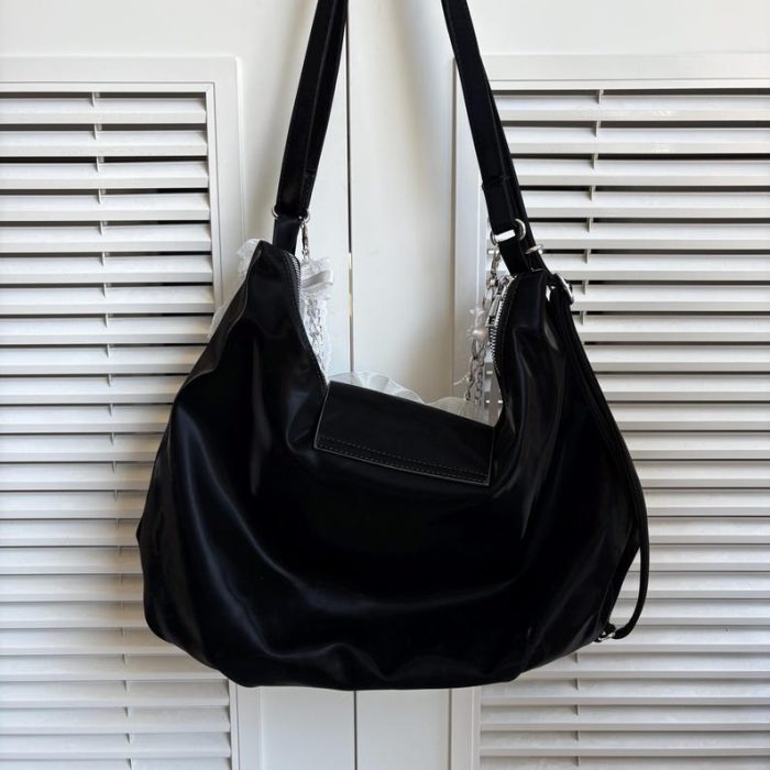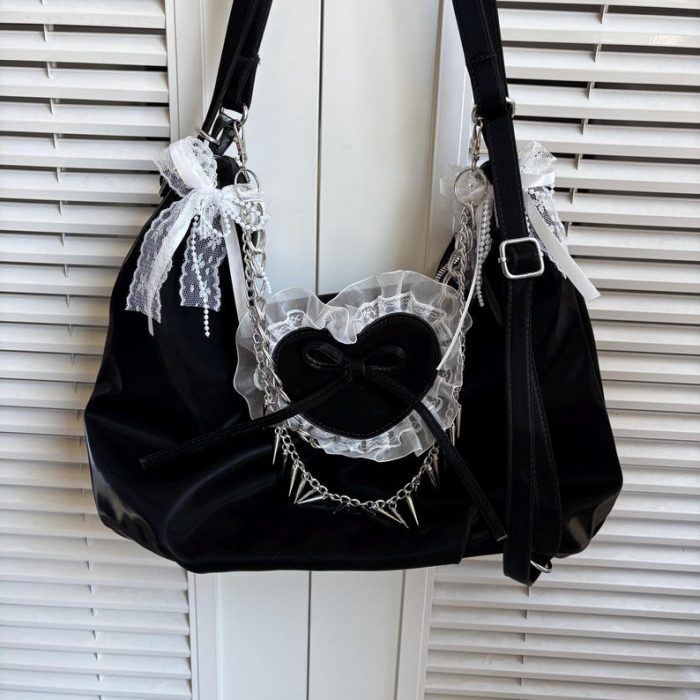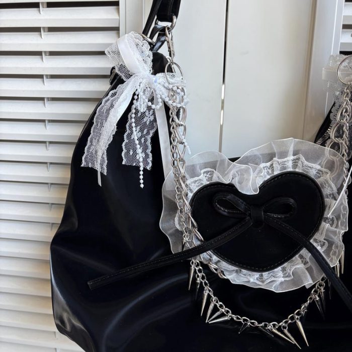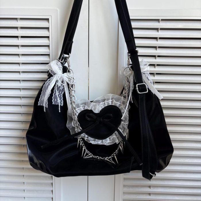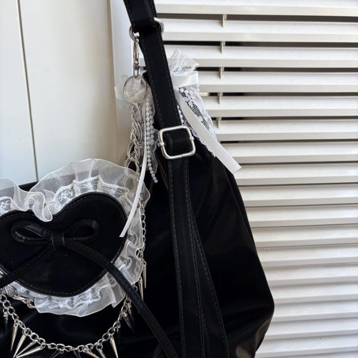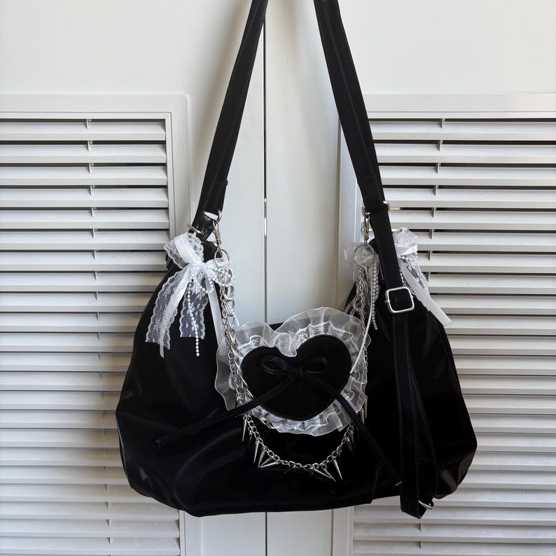 Sản phẩm được làm từ sự kết hợp của vải cotton và polyester, có kích thước rộng rãi 38 x 31 x 14 cm, tiện lợi để đựng nhiều vật dụng cá nhân. Thiết kế nổi bật với các chi tiết ren trắng, nơ, trái tim và dây xích kim loại, tạo nên vẻ ngoài ấn tượng, cuốn hút. Túi đi kèm với cả quai xách tay và dây đeo chéo, mang lại sự linh hoạt khi sử dụng.
